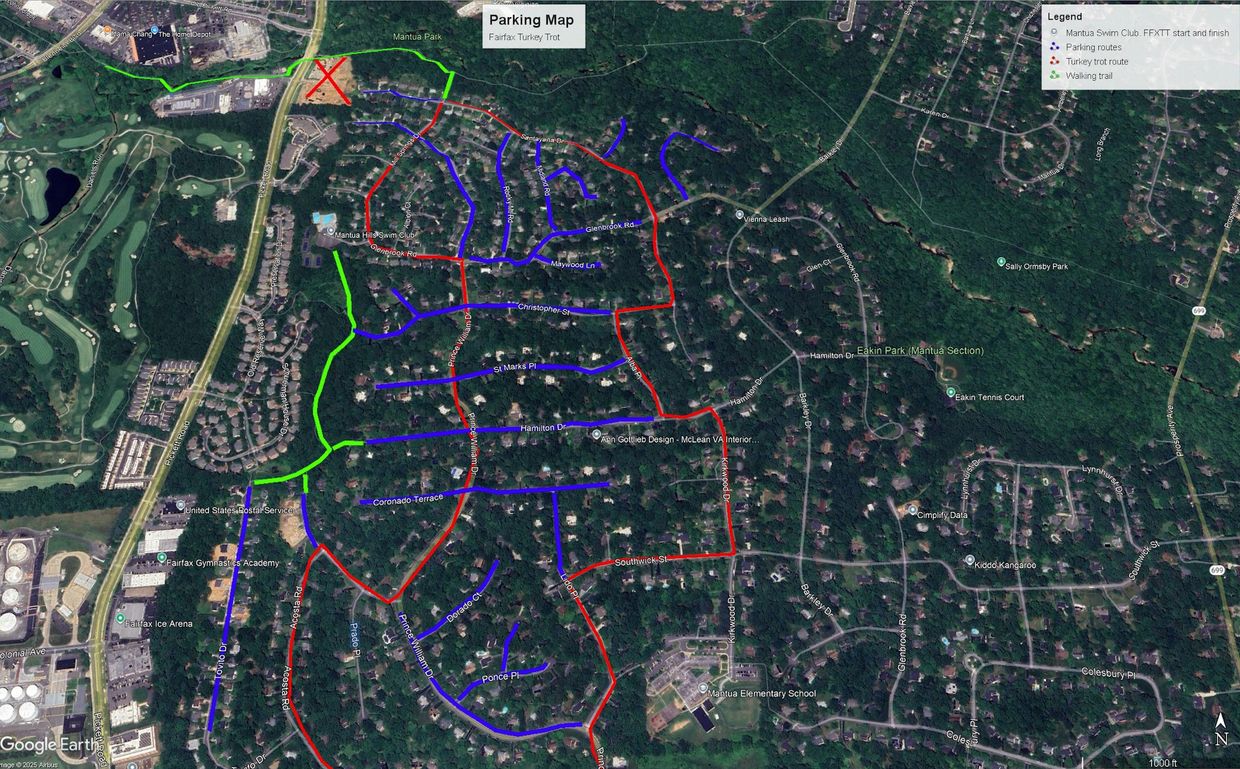 This year Thaiss is under construction so there will be no parking available like in past years. Fear not! We have helpful volunteers who will help guide you to a wonderful parking location. See the map above => PRO TIP, see the green line on the map that represents a trail that connects numerous streets with the clubhouse's FFXTT start and finish line. This trail is an easy walk and nice short cut. No matter your choice we will be prepared to assist you with convenient parking. NOTE: We will have the streets closed at both the starting and finishing streets so please avoid driving to the clubhouse.
